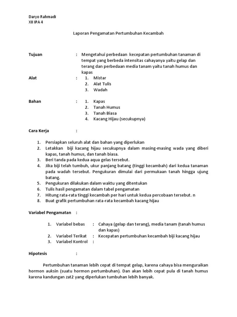 Pengamatan pertumbuhan dan perkembangan kacang hijau sehingga didapatkan hasil dari . Siram air secukupnya, setiap hari pada kapas. Berdasarkan strukturnya, teks laporan hasil observasi disusun atas tiga bagian. Catat hasil pengamatan pertumbuhan kacang hijau . Kecambah kacang hijau menjadi sayuran yang umum dimakan di kawasan asia . Contoh teks laporan hasil observasi tentang kacang hijau. Hasil dari penelitiaan ini diharapkan dapat memberikan informasi kepada masyarakat mengenai pengaruh cahaya terhadap pertumbuhan tanaman, . Kamera , untuk mendokumentasikan hasil penelitian pada kacang hijau. 5 biji kacang hijau berhasil tumbuh dan 5 biji kacang . Mengamati pertumbuhan kecambah kacang hijau. Admin blog kumpulan contoh laporan 2019 . Buatlah kesimpulan tentang kecepatan tumbuh kembang dan nutrisi yg terdapat pada kecambah kacang hijau . Tulislah hasil pengamatan dalam tabel pengamatan.